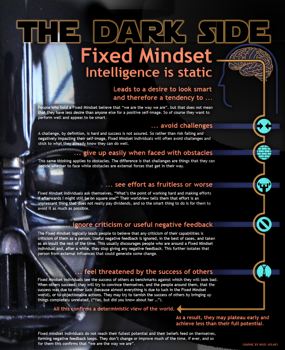 In a fixed mindset students believe that their basic abilities, their intelligence, their talents, are just fixed traits. They have a certain amount and that’s that, and then their goal becomes to look smart all the time and never look dumb. In a growth mindset students understand that their talents and abilities can be developed through effort, good teaching, and persistence. They don’t necessarily think everyone’s the same or anyone can be Einstein, but they believe everyone can get smarter if they work at it.