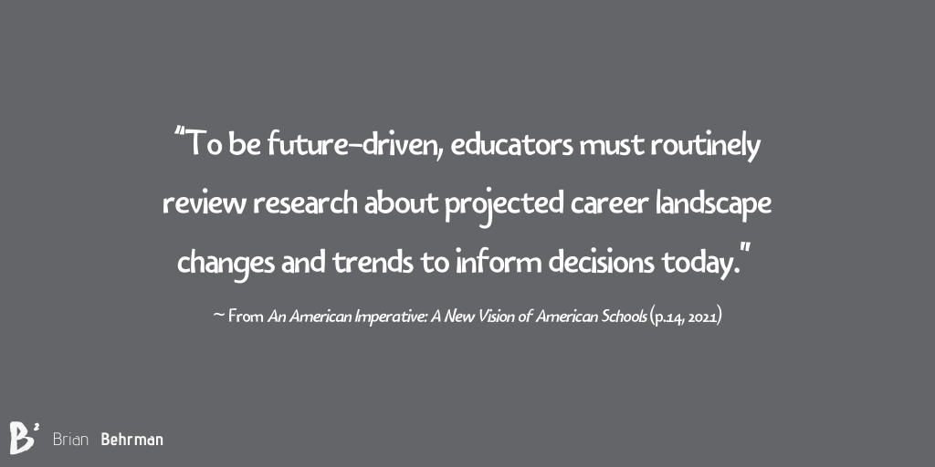 To be ready to meet the needs of our students, and have them prepared for their futures, we have to be aware of the shifting skills, knowledge, and behaviors that learners need. Instead of teaching students outdated skills that prepare them for our past. We have to filter our thinking through an understanding that our learners will be in a world that will continue to be transformed by technology acceleration, artificial intelligence, cloud computing, and more.