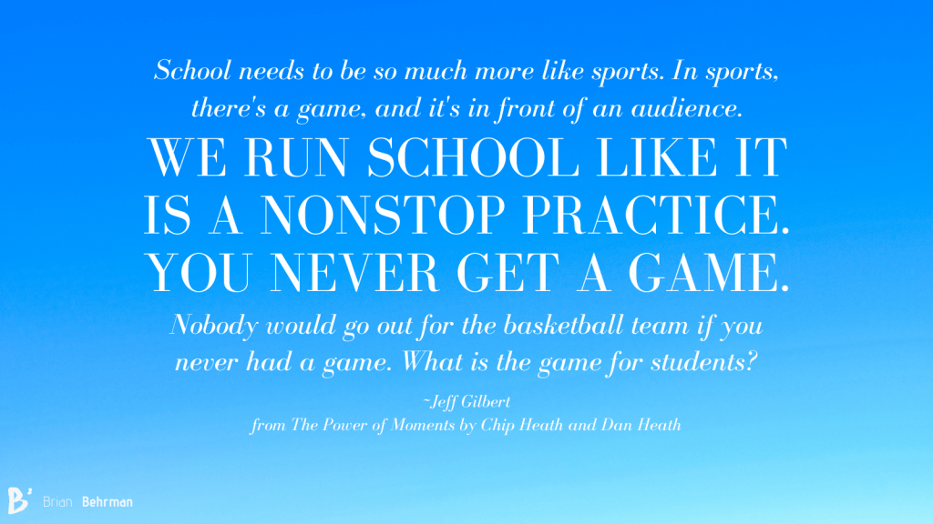 Going back to the quote above from The Power of Moments, when I read that passage, I had to put the book down for a moment. How do we go about making the experiences in our classrooms feel less like practices, and more like a game?