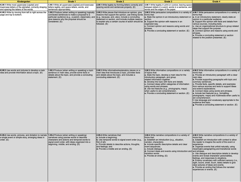I know the font is tiny, so don’t feel you need to zoom in. This is a vertical articulation guide for the essential writing standards for grades K-4. At first glance, without even digging into what they say, you might notice that they become more detailed as the grades advance. When we looked at this with our staff, several noted that they built upon one another. Suppose you were to look at the third row related to writing informative pieces—every grade level talks about being on a topic or having a central idea, and every grade level has something about including details, but the requirements and expectations of each grade level become more detailed.
