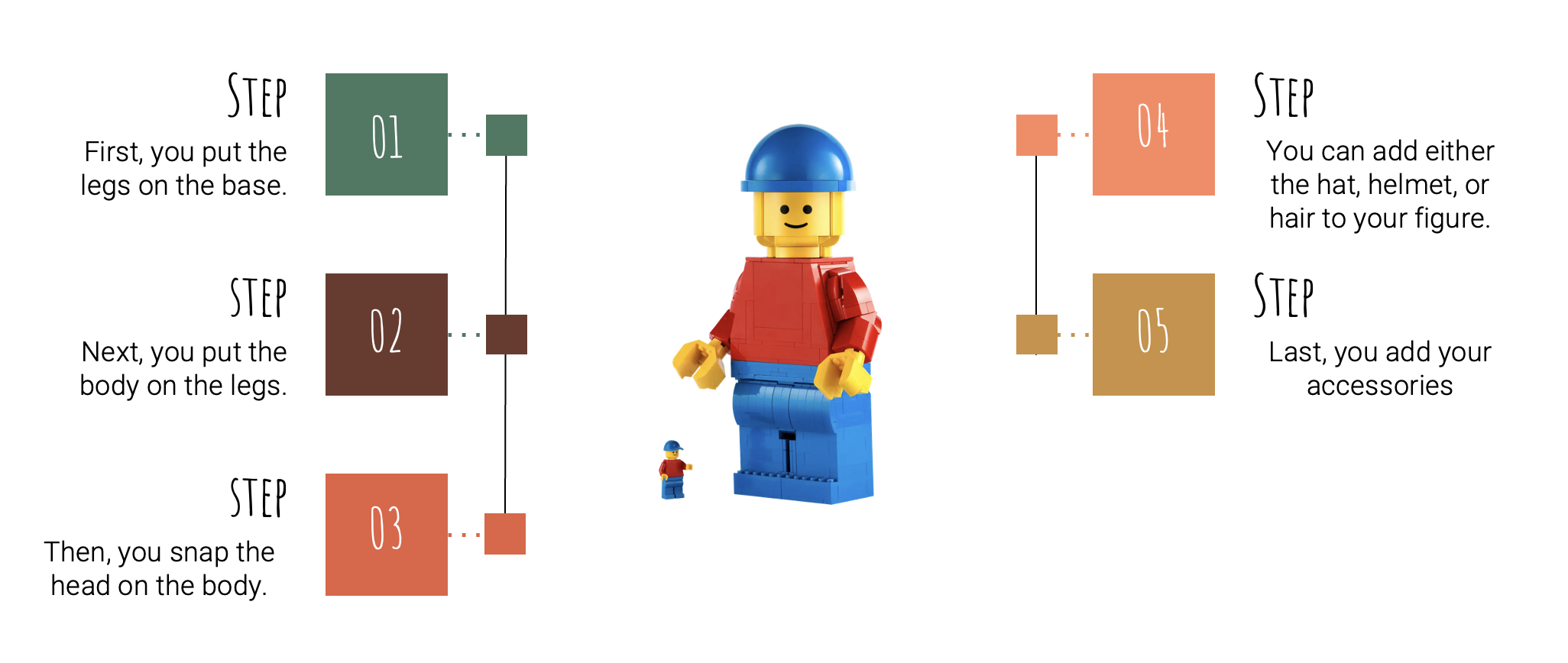 We asked one person to follow a step in the directions, revealing them one at a time and then passing the Minifigure to the next person. Once all tables had completed their Minifigures, we displayed the question: Which step could you skip and still have a completed Minifigure? The team reached a consensus that there were no steps we could forget and that we still had completed Minifigures.