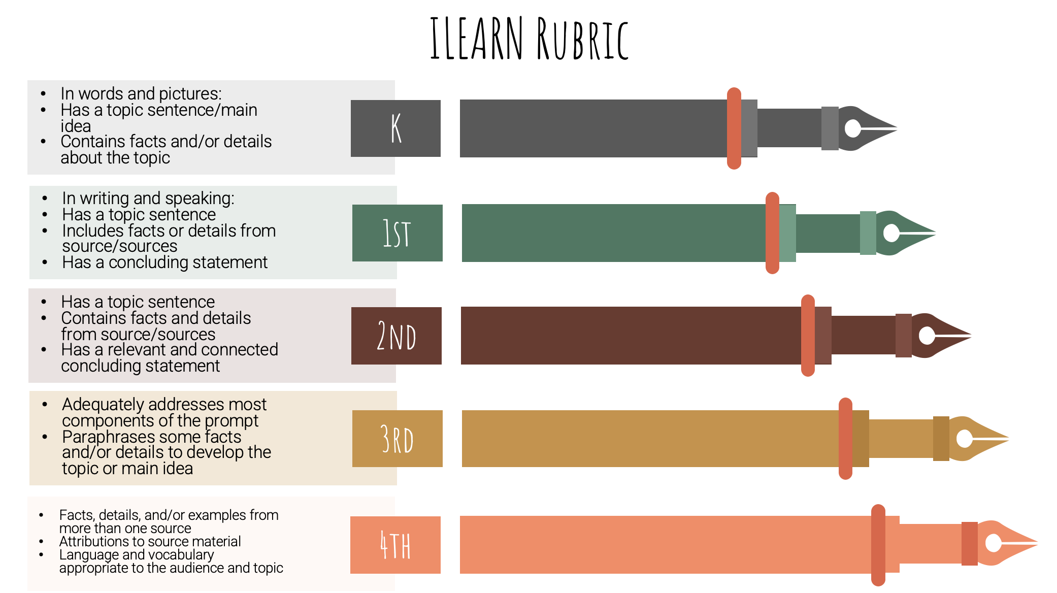 The State of Indiana has provided rubrics that are written based on the academic standards, and they are broken down into the different categories that students are assessed on during the writing portion of the ILEARN assessment. They include three focus areas – organization, evidence and elaboration, and conventions. So, we started by looking at the rubric section based on evidence and elaboration (our goal area). Unfortunately, since the ILEARN rubric only includes grades 3-8, we didn’t have a clear rubric for grades K-2 in this area. So, our leadership team had done some prework. We dug into the standards and rubrics from grades three & four and then walked the rubrics back, referencing what was included in the standards in each grade level, to create a simple bullet-pointed rubric for all grades K-4.