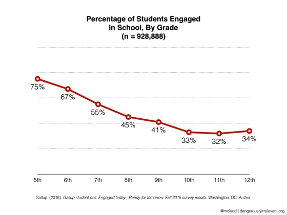 The increase in anxiety and mental health support for our students is one concerning piece, but let’s add to that another issue.  As students grow older, the general trend for all students is towards a lower level of engagement.  In a recent post on the blog Dangerously Irrelevant by Scott Mcleod, the following data from the annual Gallup poll of middle and high school students was shared: