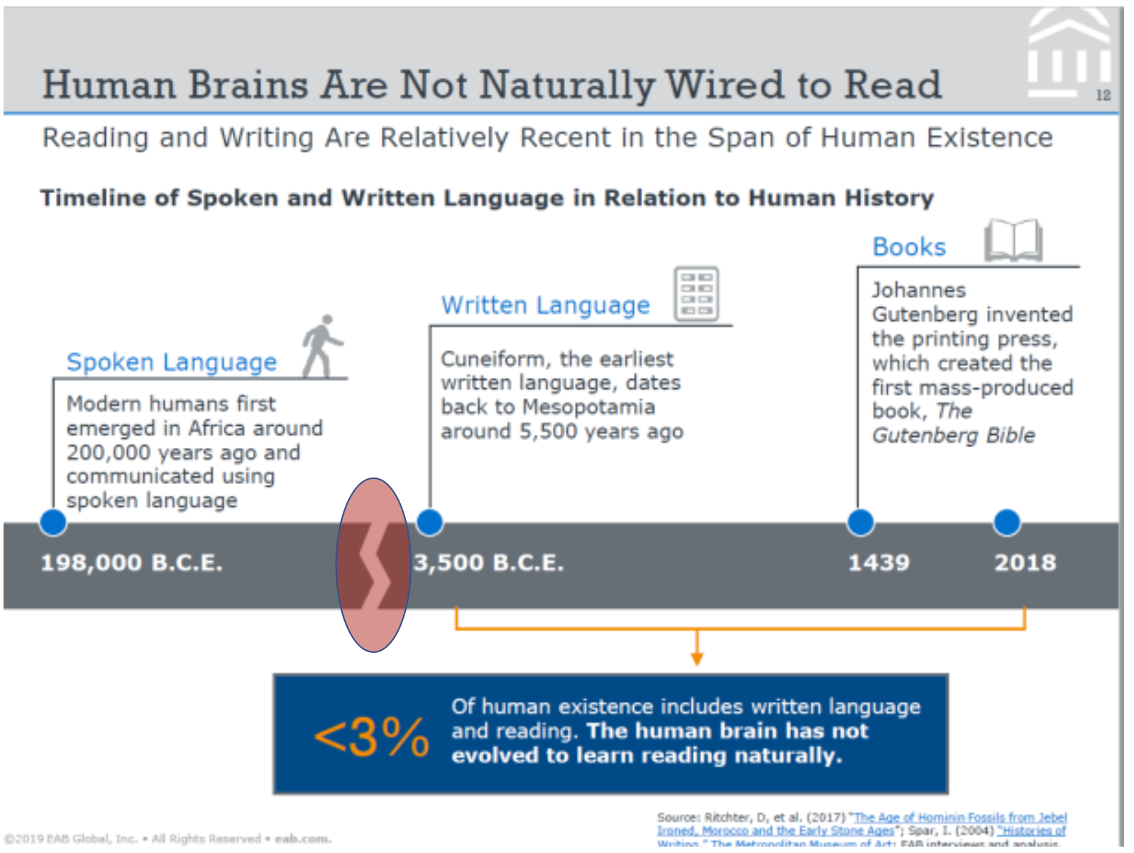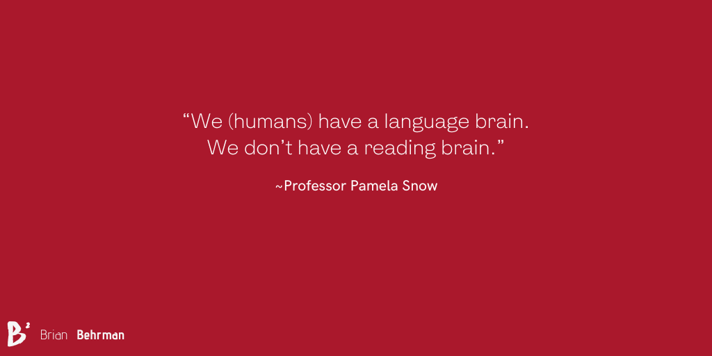 One of the first sessions I attended was led by Pamela Snow. She is a Professor of Cognitive Psychology Much of her work is centered around the early transition from language to literacy and the ways this transition is supported in the classroom. In that session, she reminded me of something that I shared in our recent PD on the Science of Reading – Human brains weren’t originally meant to be a reading brain.